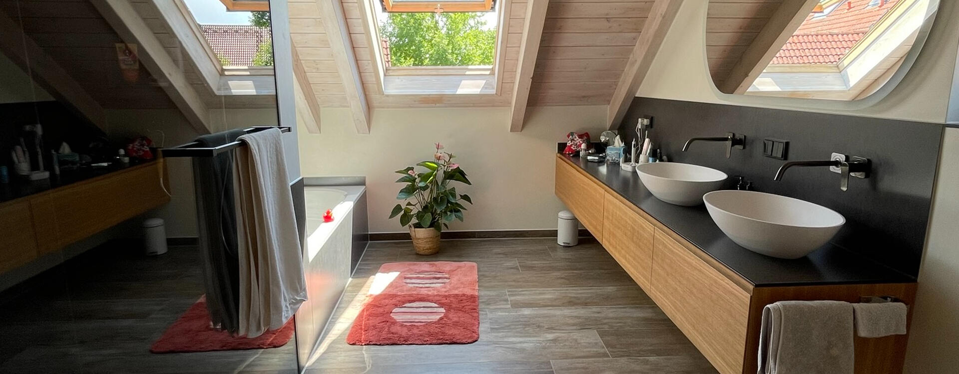 Ein vorhandener Sichtdachstuhl inspirierte den Kunden eine Holzstruktur als Feinsteinzeug als Bodenbelag verwenden. Die Form der Aufsatzbecken aus Mineralwerkstoff am Waschtischmöbel wurde am beleuchteten Spiegel wiederholt und unterstreicht die Einzigartigkeit des Bades.