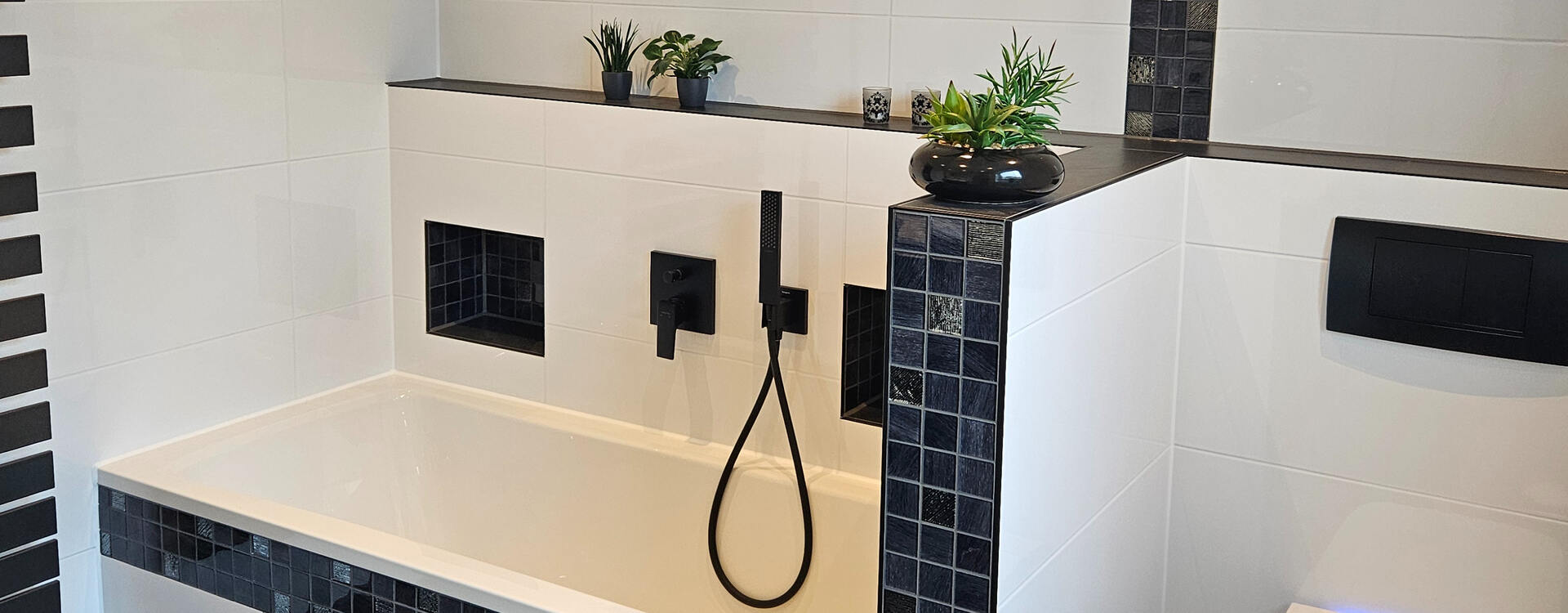 Ein stilvolles Bad in klassischem Schwarz-Weiß-Design. Die kontrastreichen Fliesen und eleganten schwarz matten Armaturen verleihen dem Raum eine zeitlose Eleganz.
