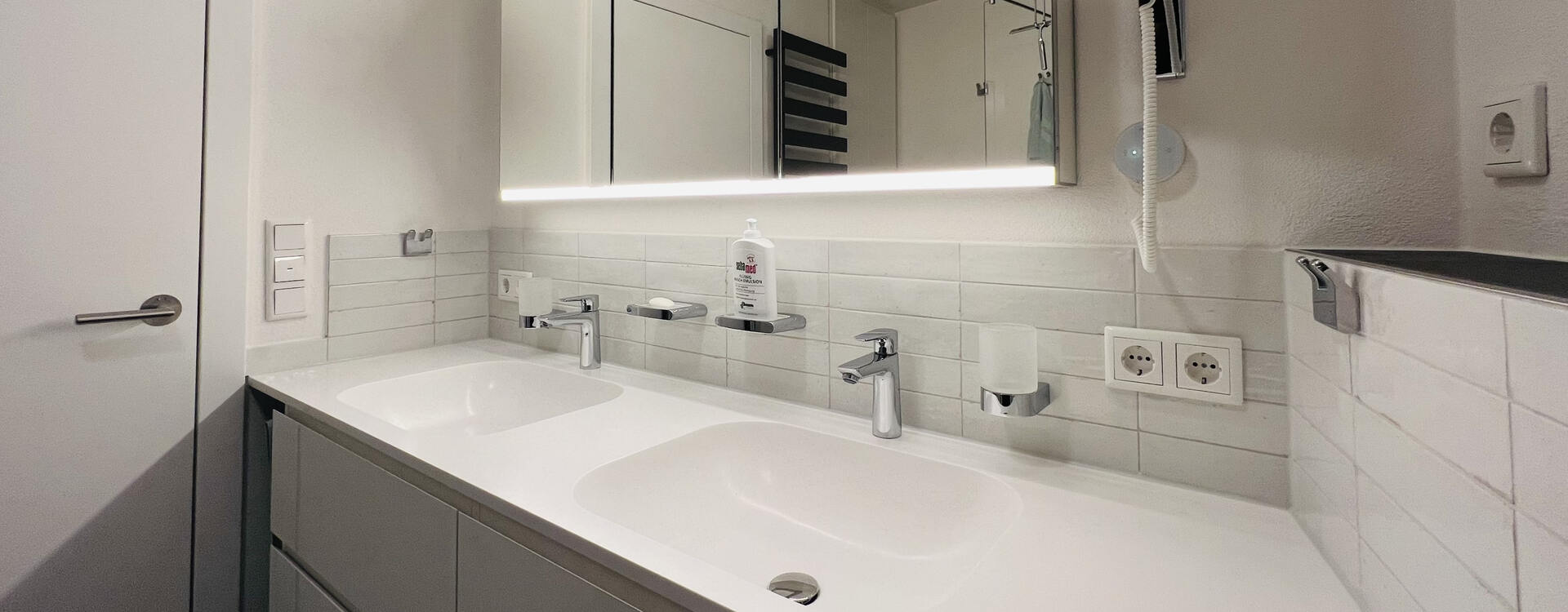 Bei dieser Badsanierung war einiges an Maßarbeit gefordert. Angefangen bei der Dusche, deren Einbauhöhe für eine geflieste Dusche exakt ausgereicht hat. Bis hin zur perfekt eingepassten Waschtischanlage mit 2 Becken und ausreichend Abstellfläche, welche auf der rechten Seite sogar an eine schräge Wand angepasst wurde.