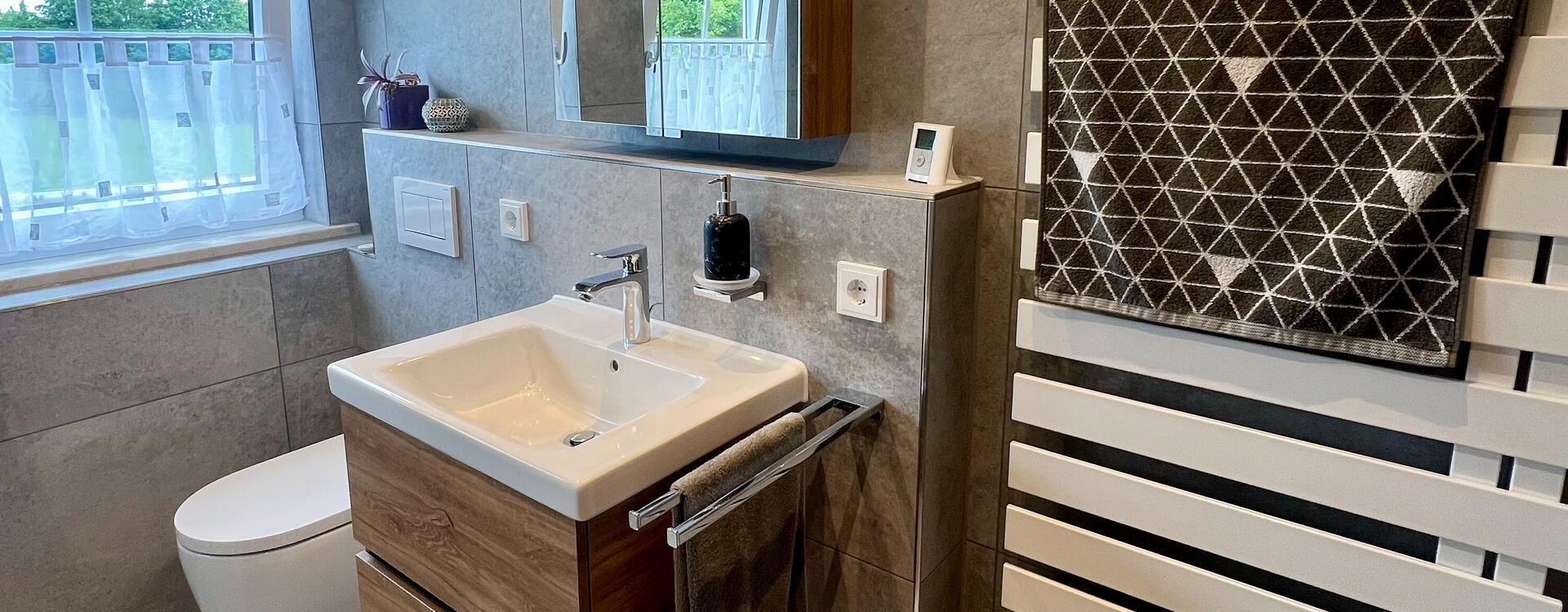 Das Ergebnis ist ein funktionaler, gut durchdachter Raum. Nach wie vor ein beliebtes Highlight im Bad – das Dusch-WC. Dieses haben die Kunden bei uns im Showroom getestet und waren sofort überzeugt – das macht Sinn.