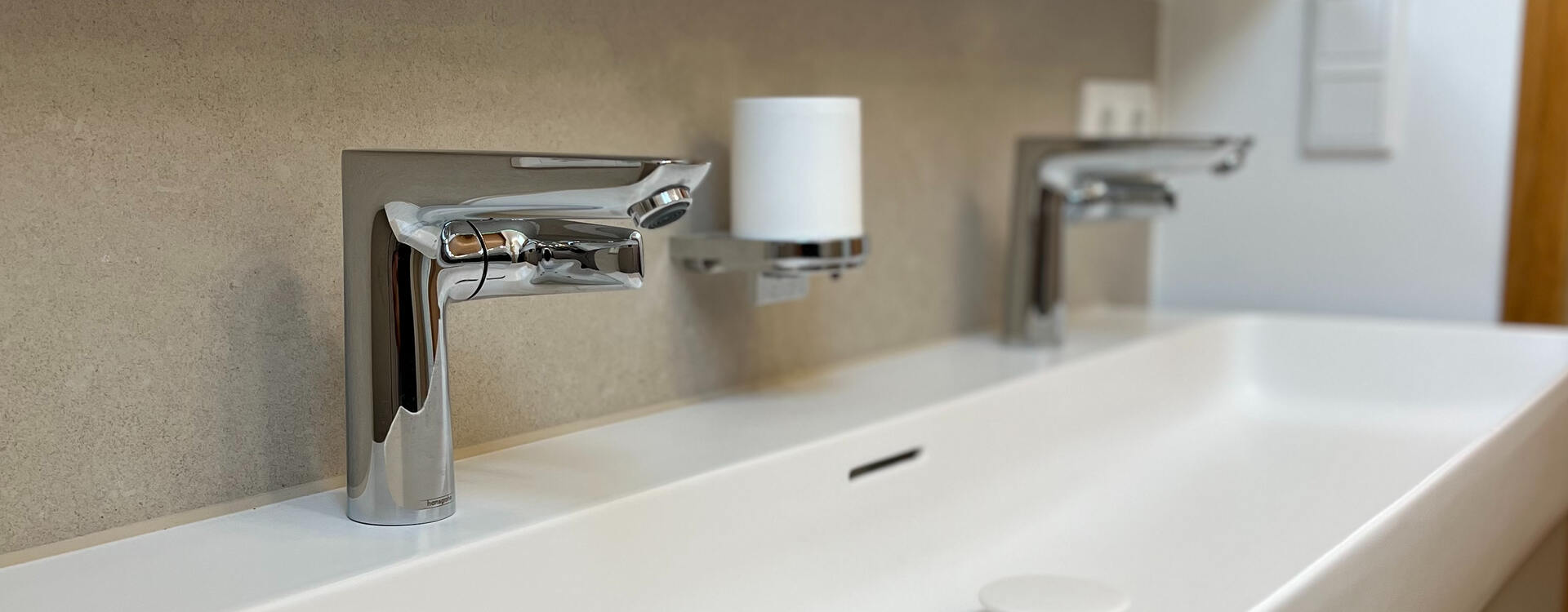 Sinnvoller hätte man diesen Raum nicht gestalten können. Versteckt hinter einer Mauer, welche zugleich als WC-Wand dient, findet sich eine geräumige Wohlfühldusche wieder. Diese hält so einige Highlights bereit: gemauerte Sitzgelegenheit, entspannende Kopfbrause und eine Nische für sämtliche Utensilien. Abgerundet wird das Konzept mit großen Feinsteinzeug-Fliesen, die nahezu fugenlos verlegt werden.
