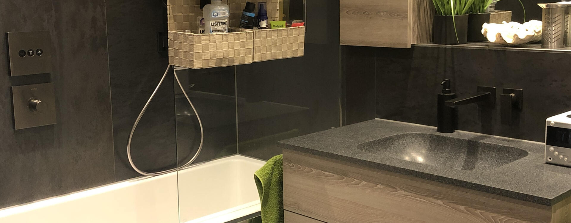 Fugenlose Wandbelege und ein asymmetrischer Spiegel über der Waschtischanlage lassen das Bad größer wirken. Ebenso wurde ein Platz für die Infrarotbehandlung gefunden.