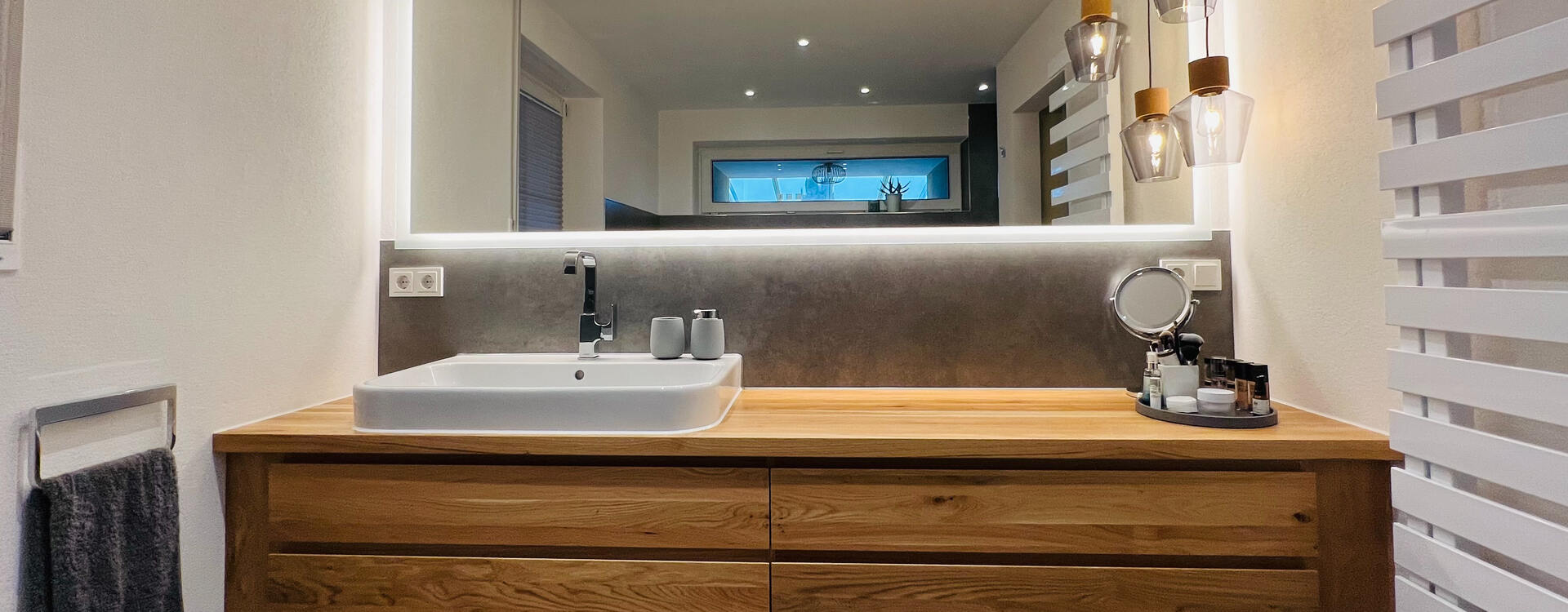 Die Wohnlichkeit integrieren wir mit einer angepassten Massivholz-Waschtischanlage. Links Waschplatz – Rechts Beauty. Zusätzlich schaffen wir Staumöglichkeit für ein aufgeräumtes Badezimmer.