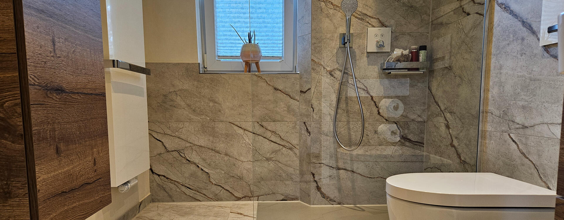Durch die Verwendung einer individuell anpassbaren Duschfläche konnte die neue offene Dusche ideal an die Wand angepasst werden.