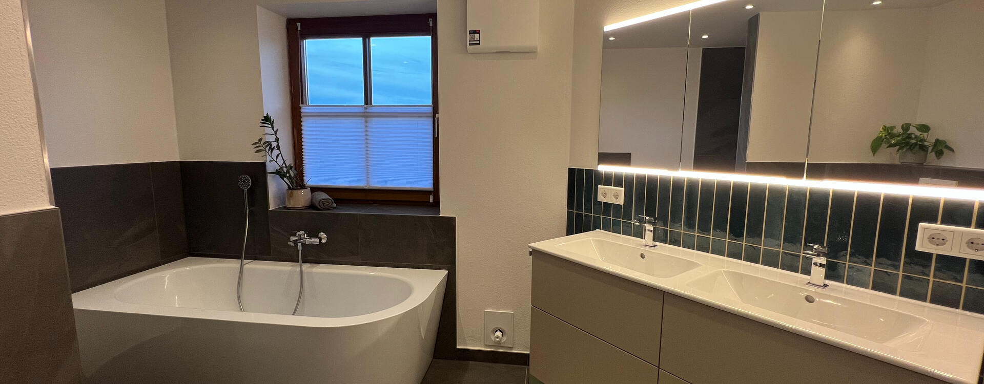 Das Hauptbad zeigt sich großzügig und elegant. Dunkelgraue Feinsteinzeugfliesen kombinieren sich mit hellen Wandflächen zu einem modernen Gesamtbild. Ergänzt wird das Konzept durch eine teilfreistehende Badewanne, eine bodenebene Dusche und einen Doppelwaschtisch mit schöner Akzentrückwand aus dunkelgrünen Fliesen.