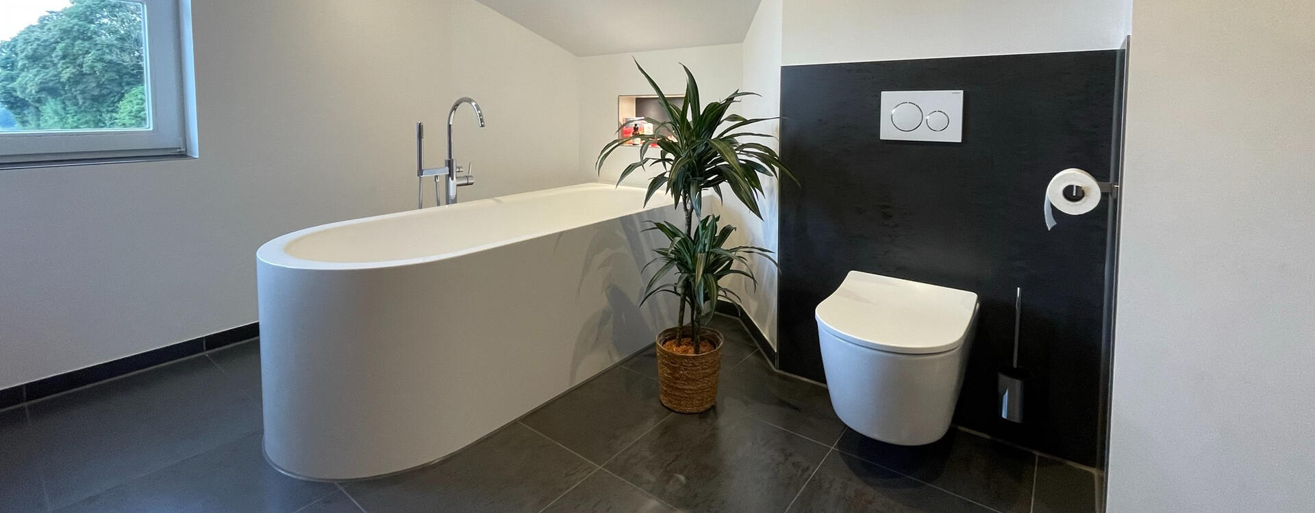 Eine freistehende Badewanne in mattem Mineralwerkstoff, passend zur Waschtischplatte, ergänzen sich zu den fugenlosen Feinsteinzeug-Platten an der Wand.