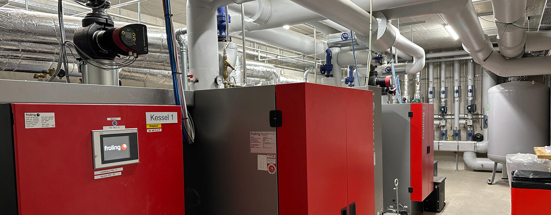 Zur Ausführung kamen drei Fröling Hackgutkessel mit je 250 kW Leistung, eine modulare Elektroabgasfilteranlage und einem Pufferspeicher mit 25.000 l Inhalt.